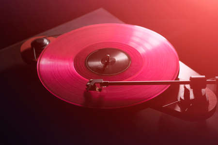Vinyl DJ turntable in club lighting. close-up. pink tint. retro style