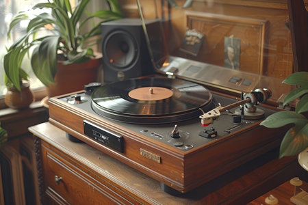 A vintage turntable with a spinning vinyl record sits gracefully in a cozy living room, surrounded by plants and warm decor, creating a nostalgic atmosphere.