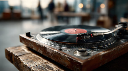 A vintage turntable spins a classic vinyl record in a cozy cafe. Warm lighting creates a relaxed atmosphere as customers enjoy their drinks and music fills the air.