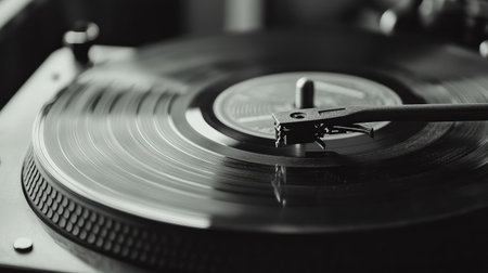 Experience the charm of a vintage turntable as it plays a vinyl record, showcasing the intricate needle and textured grooves in a timeless monochrome setting.