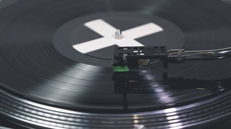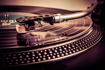 Turntable vinyl record player. Retro audio equipment for disc jockey. Close up of turntable needle on a vinyl record. Turntable playing vinyl. Needle on rotating black vinyl.