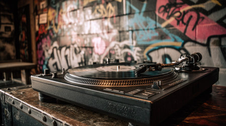 Old-school hip-hop vibe with a black DJ turntable, graffiti wall backdrop, and warm ambient lighting