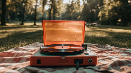 A charming record player rests on a checkered blanket in a sunlit park, inviting listeners to enjoy music amidst lush greenery and warm sunlight, creating a tranquil atmosphere.