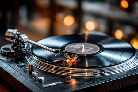 Close-up of a vintage turntable playing a vinyl record, highlighting sleek design and warm lighting, perfect for music lovers and retro enthusiasts.