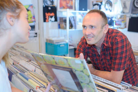 A the and client browsing through a collection of vinyl records discussing potential songs to incorporate into future sessions