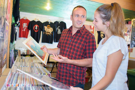 two caucasian people choosing cd in music shop. Horizontal shape, front view, head and shoulders, focus on background