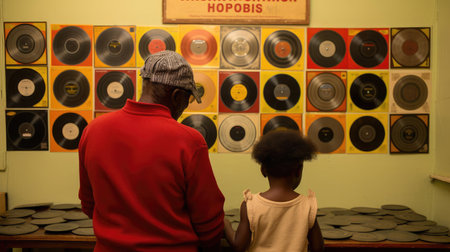 Exploring vintage vinyl collection in retro music store setting.