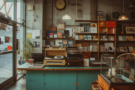 retro store with vintage-inspired signage, tall shelves filled with memorabilia, and vinyl records on display, created with generative ai
