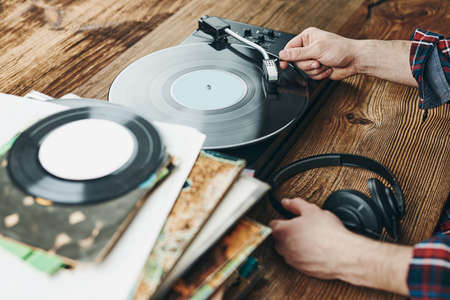 Man listening to music from vinyl record. Playing music from analog disk on turntable player. Enjoying music from old collection. Relaxing at home. Retro and vintage. Music passion