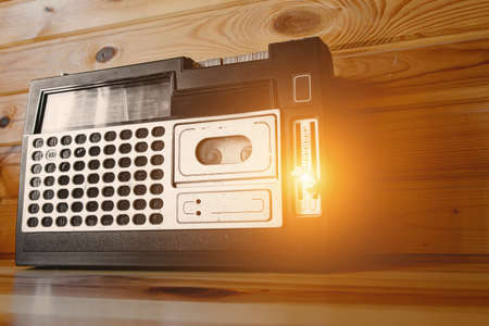 Old cassette tape recorder on wooden background