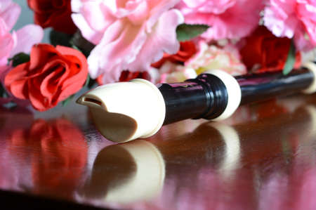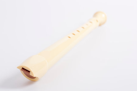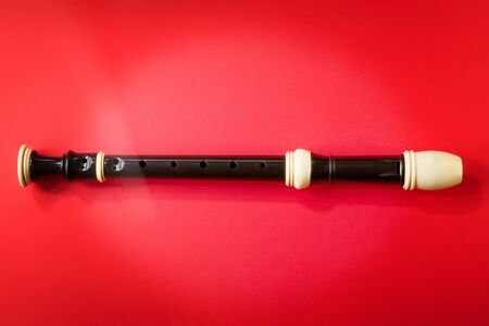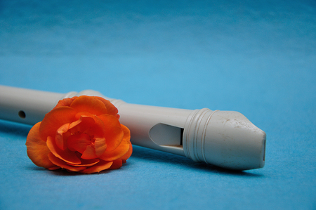 A closeup view of a typical recorder musical instrument for playing tones of classical melody.