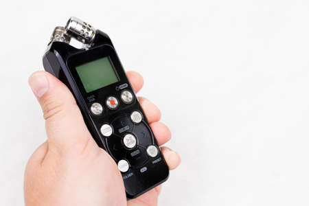 Digital voice recorder in the hand above white background with copy space