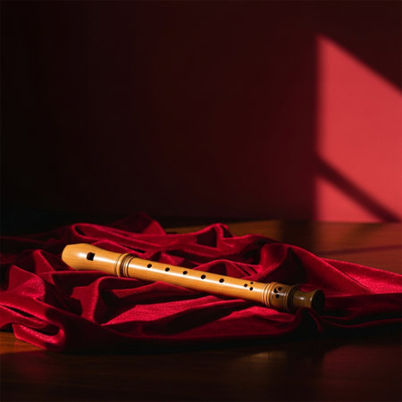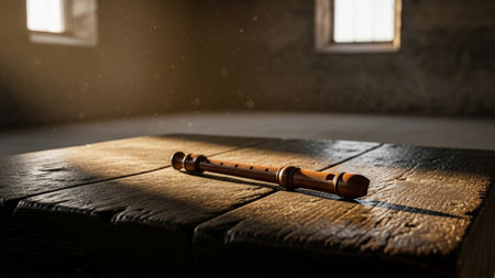 A cinematic, wide environmental still life capturing a simple, dark wooden recorder resting on a mas