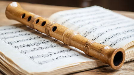Close-up view of a wooden recorder resting on open sheet music that features elegant musical notes, creating a serene atmosphere perfect for musicians.