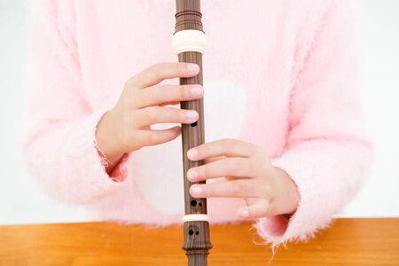 Little Asian girl playing a recoreder/flute in her study room