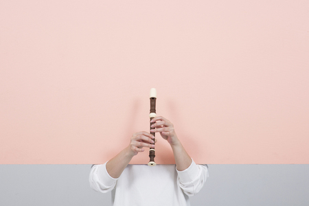Person playing wooden recorder in white blouse. Studio portrait with pink background. Musical performance and classical music concept for design and print.