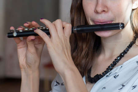 A gorgeous young woman sitting and playing the flute piccolo Close-up