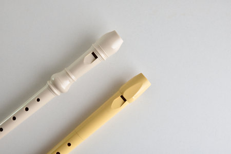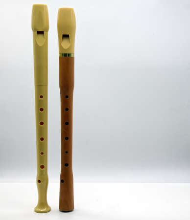 Detail of two different plastic recorders in shape and color on a white table in a diagonal position. Top view.