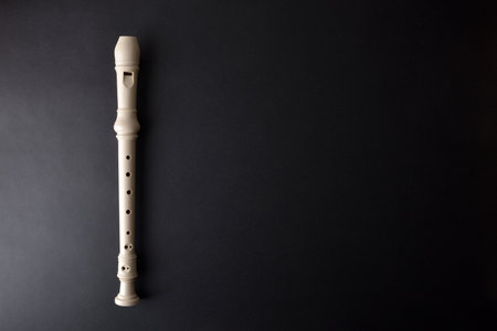 Musical background with overview of white plastic recorder on black textured background. Top view.
