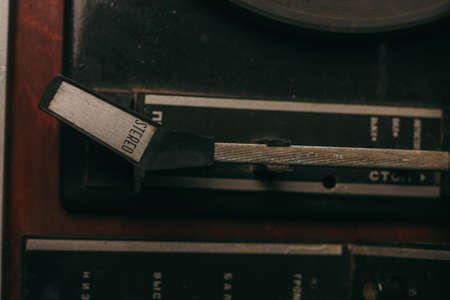 Close-up of old retro radio receiver music cassette audio tape recorder dark room. Selective focus.