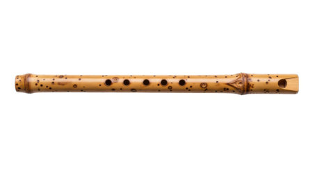 A close-up studio shot of a traditional bamboo flute, showcasing its natural wood grain and precisely placed finger holes. This instrument evokes cultural heritage and melodic music.