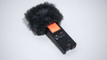 Tascam DR-22WL Digital Audio recorder. Portable field recorder on white desk with wind shield, deadcat.