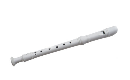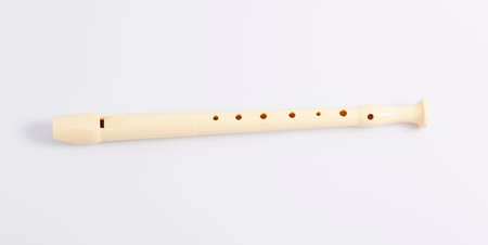 White plastic flute, musical instrument, isolated on white background. Concept, traditional musical instrument. Blowing type with melody tone holes,