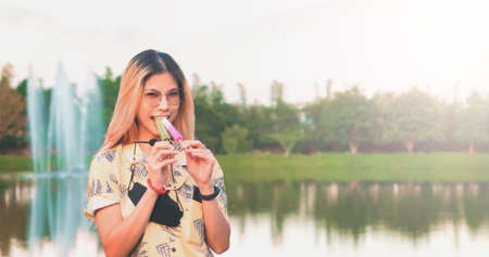 Woman with sunglasses is eating two ice cream in a park with summer weather.