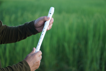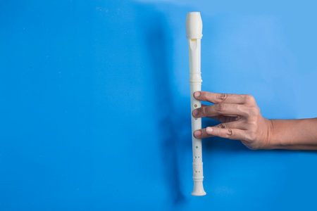 Close up hands hold a white recorder flute. Concept, music blowing with mouth, control with fingers on holes of flute for melody and rhythm. Mouthpiece musical instrument.