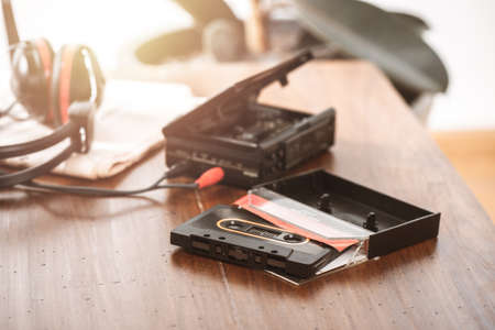 Old audio cassette with walkman and headphones