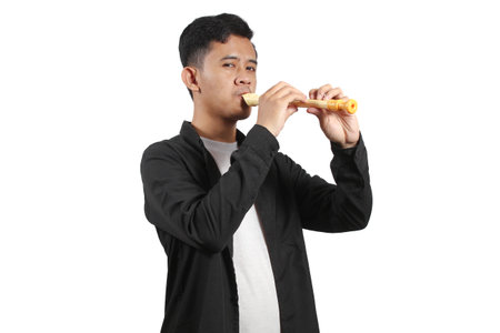 Young asian man playing the flute isolated on white background.