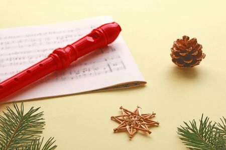 yellow christmas background with a red recorder lying on a sheet music, pine branch, pine cone and straw star