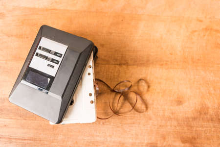 Personal stereo with a cassette tape inside on a worn wooden board