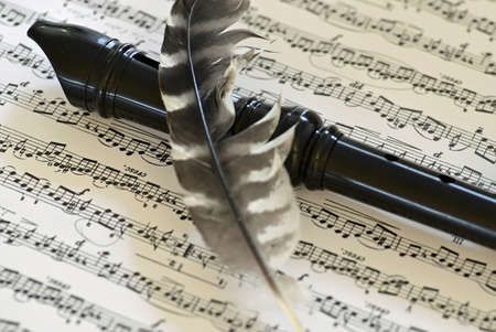 Black flute and feather on musical note background