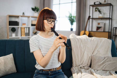 Young woman plays the flute on bright living room at home. Girl sitting on sofa with a musical instrument indoor. Pretty young woman study to play flute.