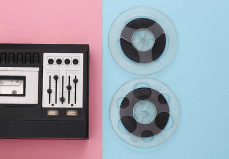 Retro flat lay. Retro stereo recorder and audio magnetic tape reel on blue pastel background. top view. 80s
