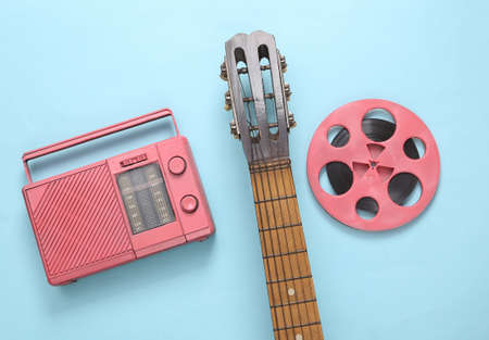 Acoustic guitar, audio reel and radio receiver on blue background. musical concept. top view. flat lay