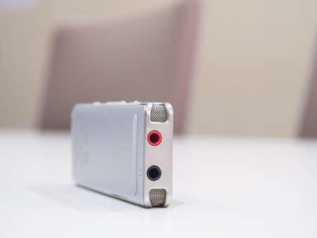 Dictaphone on white table while business meeting close up