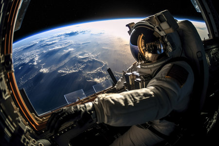 Astronaut looking planet earth from the window of his capsule. Concept about science and space exploration