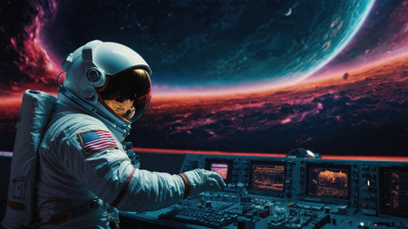 An astronaut wearing virtual reality goggles sits inside a spacecraft, engaging with a high-tech interface. The view through the window reveals Earth and distant celestial bodies, illustrating space.