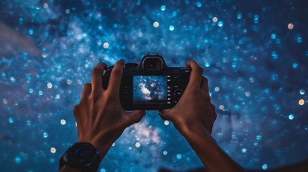 A panoramic shot of a male taking professional pictures of a planet in the galaxy