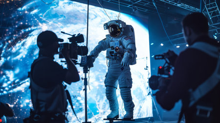 white suit with spacesuit astronaut in space. He has a small camera around his neck. filming in the atmosphere. astronaut protective suit.