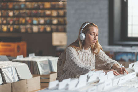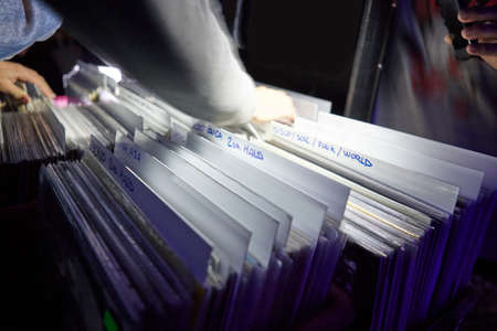 Music store for vinyl records. Buying vintage records. Music, old school, retro concept.