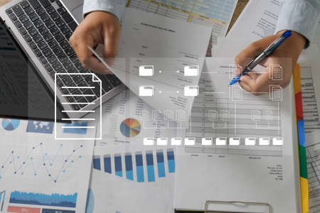 Businessman working and prepare paperwork report data to analysis information in file binder at office.