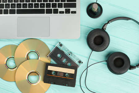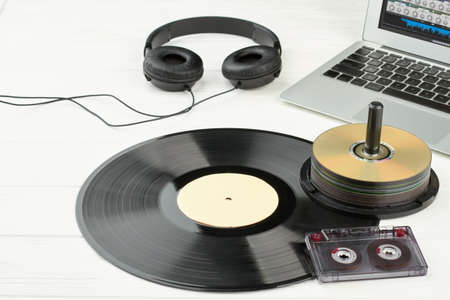 Modern and obsolete devices and gadgets. Desk of musician or songwriter with laptop, headphones, vinyl record, compact discs and audio cassettes. Evolution of technology concept.