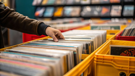 A person's hand is shown from a close-up, low-angle perspective, flipping through a crate of black vinyl records in a record store. The shelves are filled with albums, and the warm, slightly dusty atmosphere evokes a sense of nostalgia. The image captures the experience and love for finding new music in a physical format.