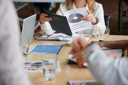 Cropped shot of a professional female manager training and coaching her financial staff in the office workplace. financial report paperwork in a binder folder.