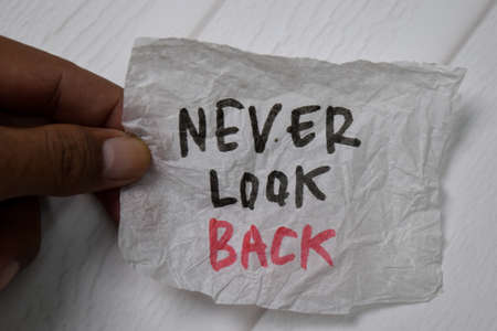 Never Look Back write on crunched paper isolated on wooden table.