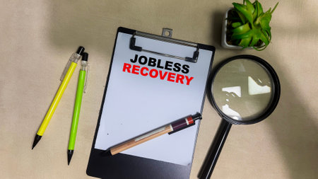 Concept of Jobless Recovery write on paperwork isolated on Wooden Table.