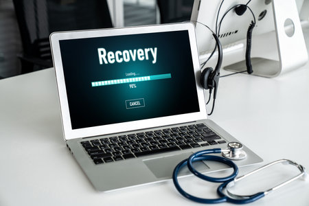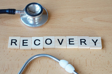 Stethoscope beside wooden letters spelling recovery, symbolizing healing, health care, and medical rehabilitation.
